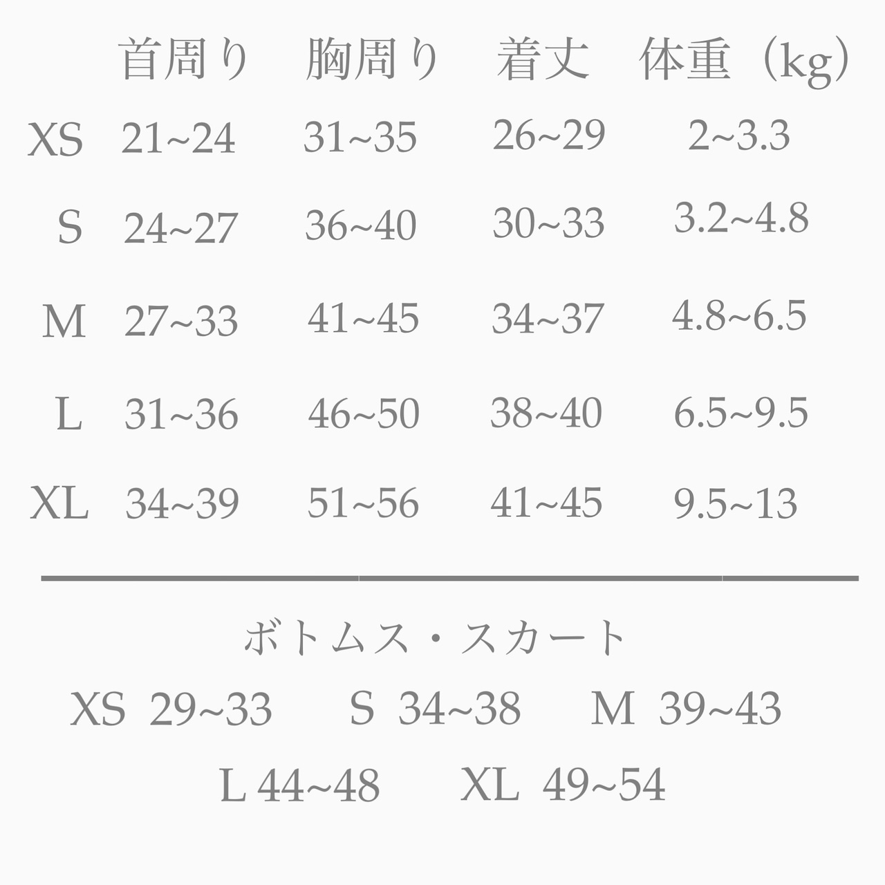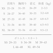 XL ①着丈41 ~ 45 ②首周り34 ~ 39 ③胸周り51 ~ 56