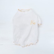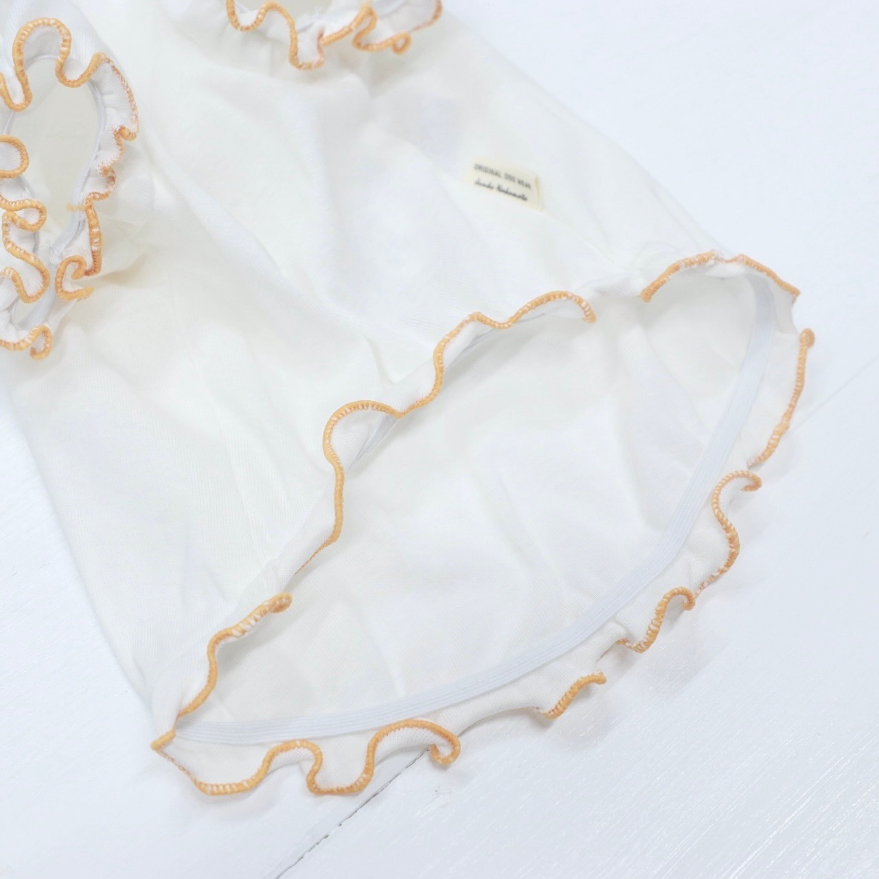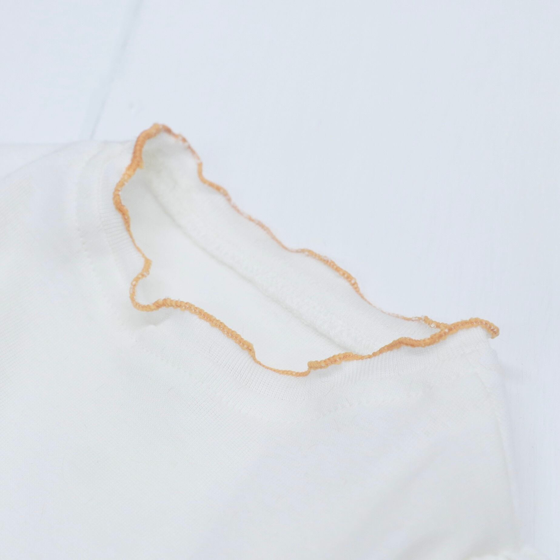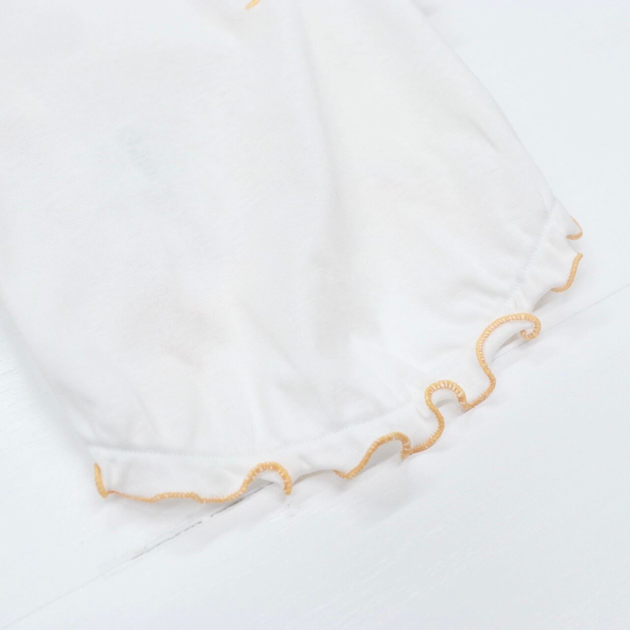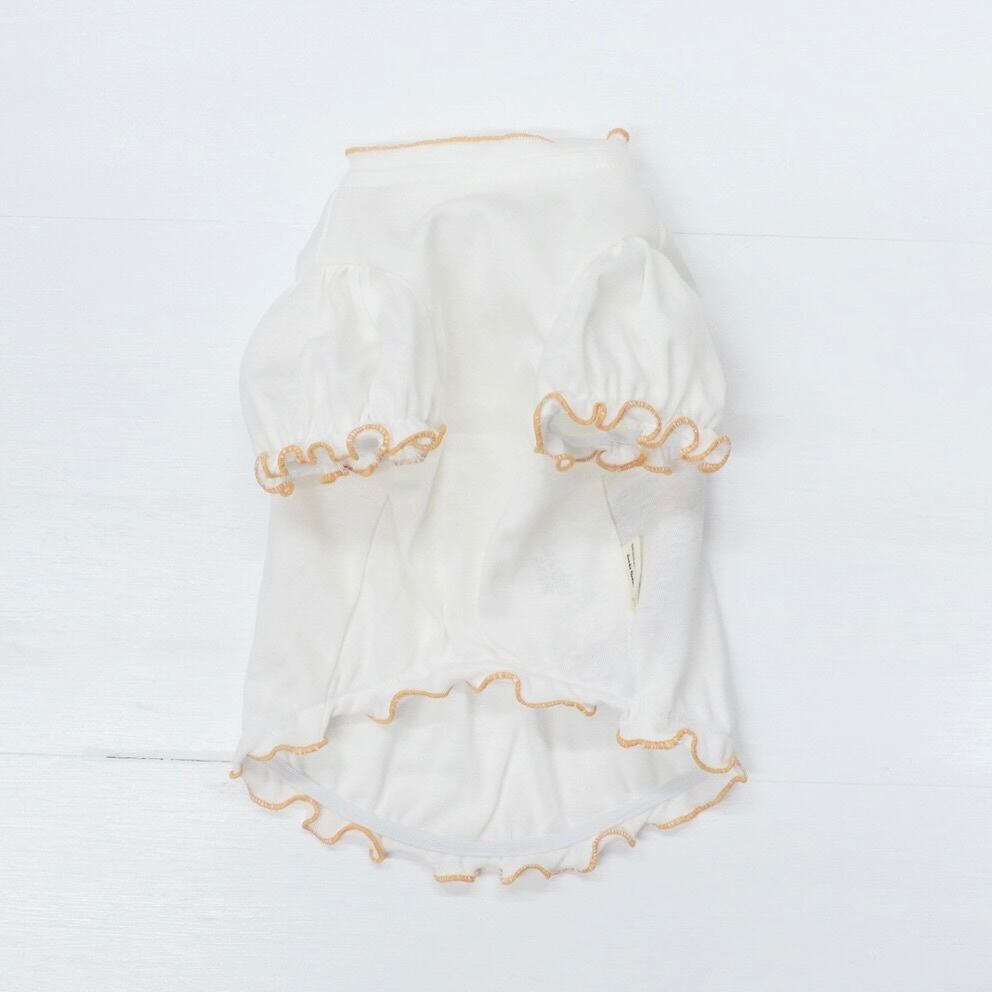 首元と裾がパステルカラーのオレンジフリルになっていて